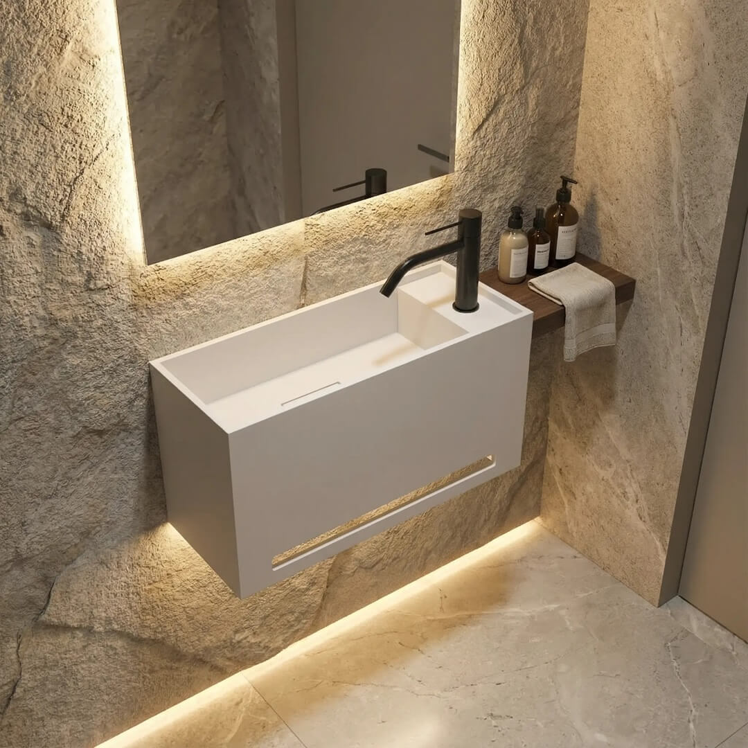 כיור שירותי אורחים 60/25 גובה 35 ס”מ כולל במה פנימית מונמכת כולל פתח למגבת.