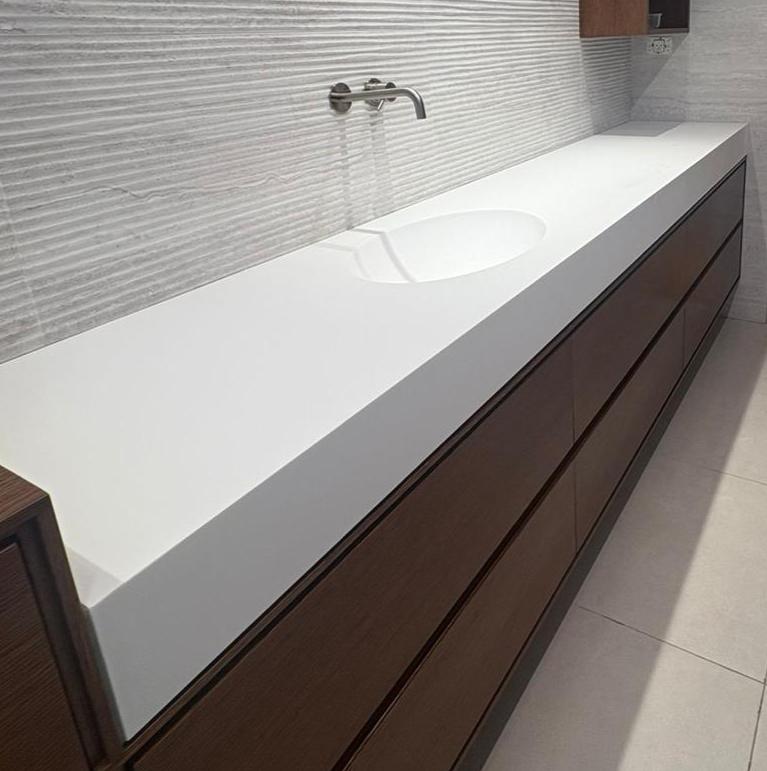 משטח כיור מעובה (סינר) עד 13 ס”מ כולל כיור אובלי בגימור מט משי. כיור בהדבקה תחתונה ללא חיבורים וללא תפרים.